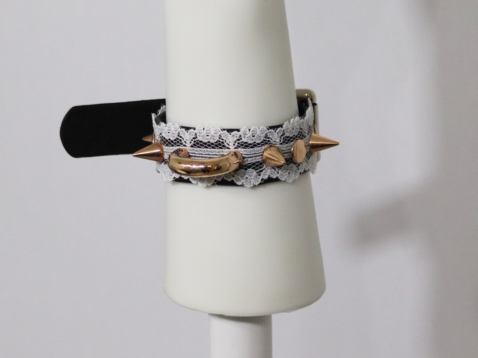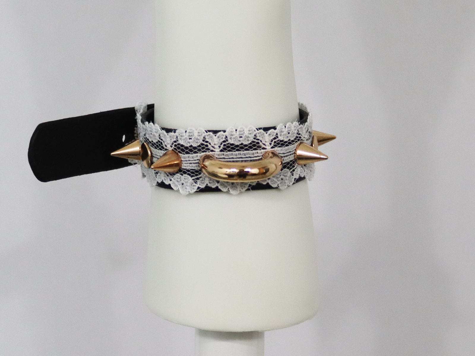 This cuff is adorned with white lace, rivets, short spikes, and a central arch.