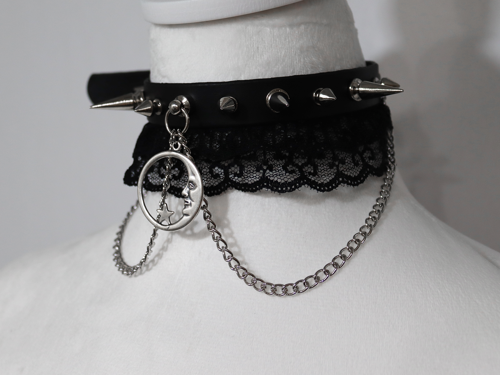 This choker is adorned with a two-layered black lace, short and long tree spikes, chains, and a crescent moon pendant. The pendant is made of brass with silver electroplating.