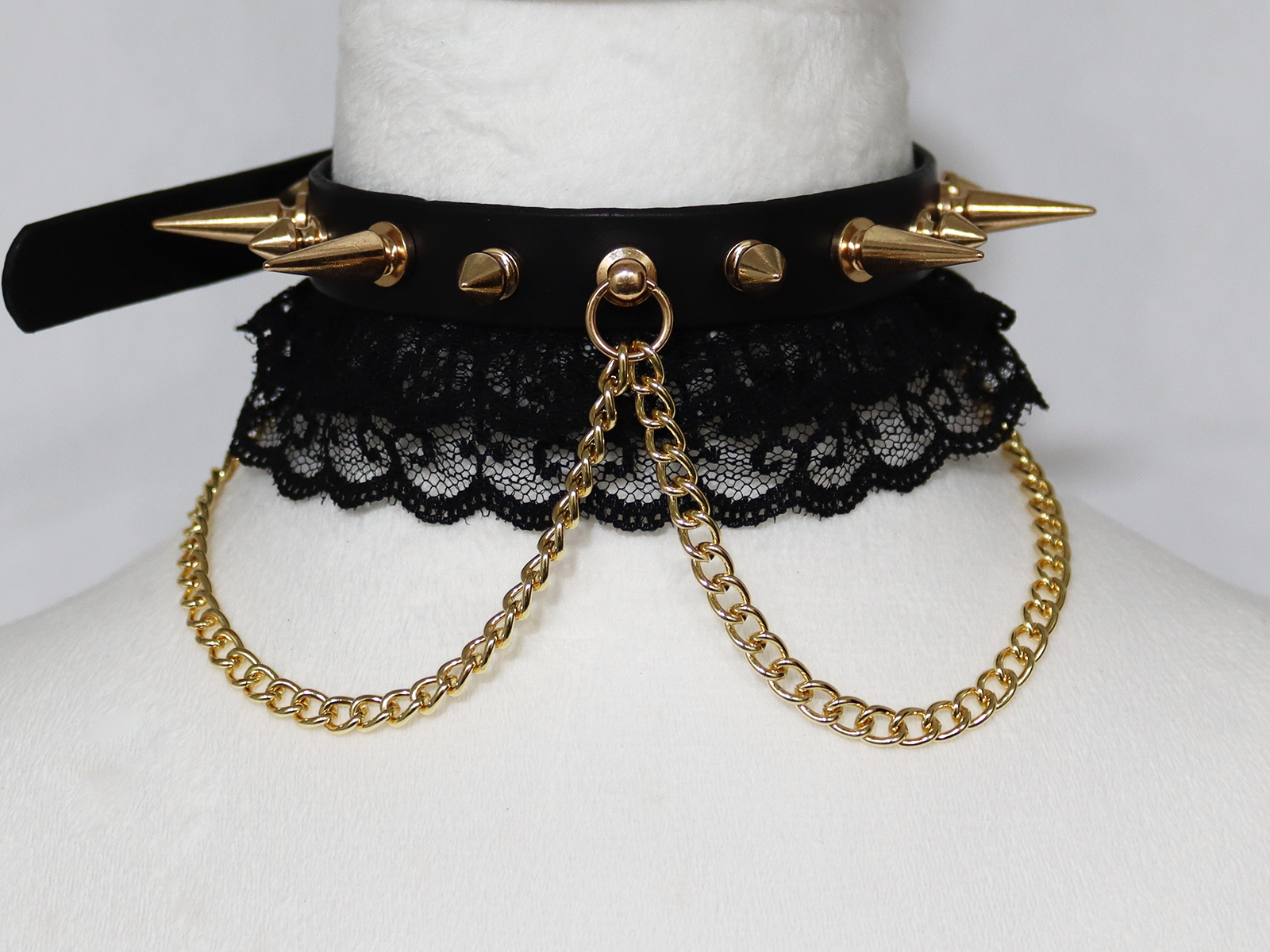 This choker is adorned with a two-layered black lace, short and long tree spikes, and chains.