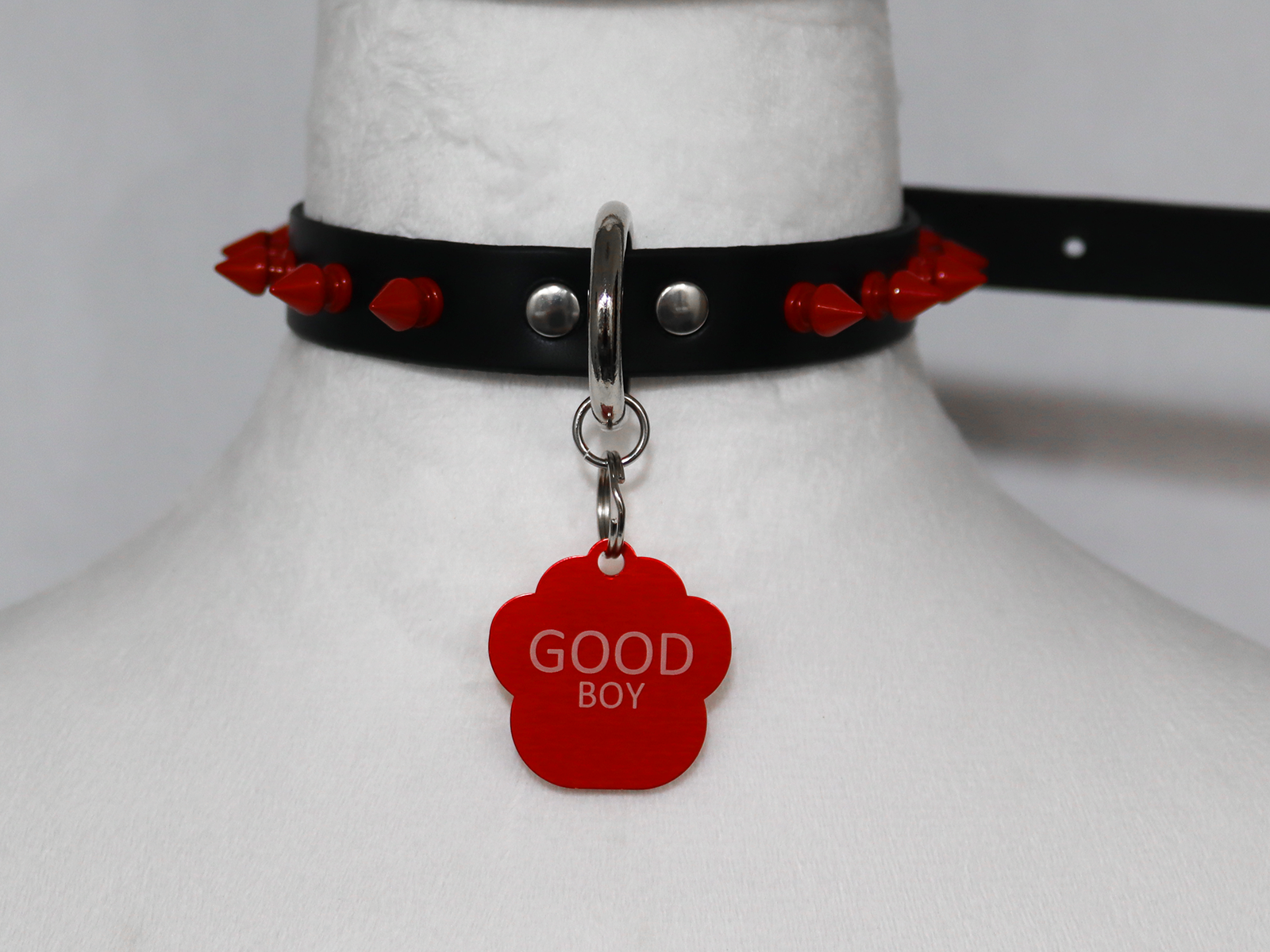 This choker is adorned with short red tree spikes and a heavy duty .75 inch D-ring.