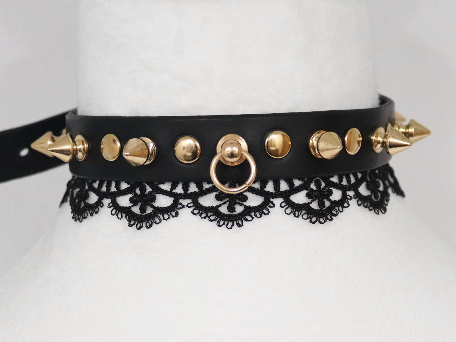 This choker is adorned with dainty black lace, a small central O-ring, small tree spikes, and rivets.