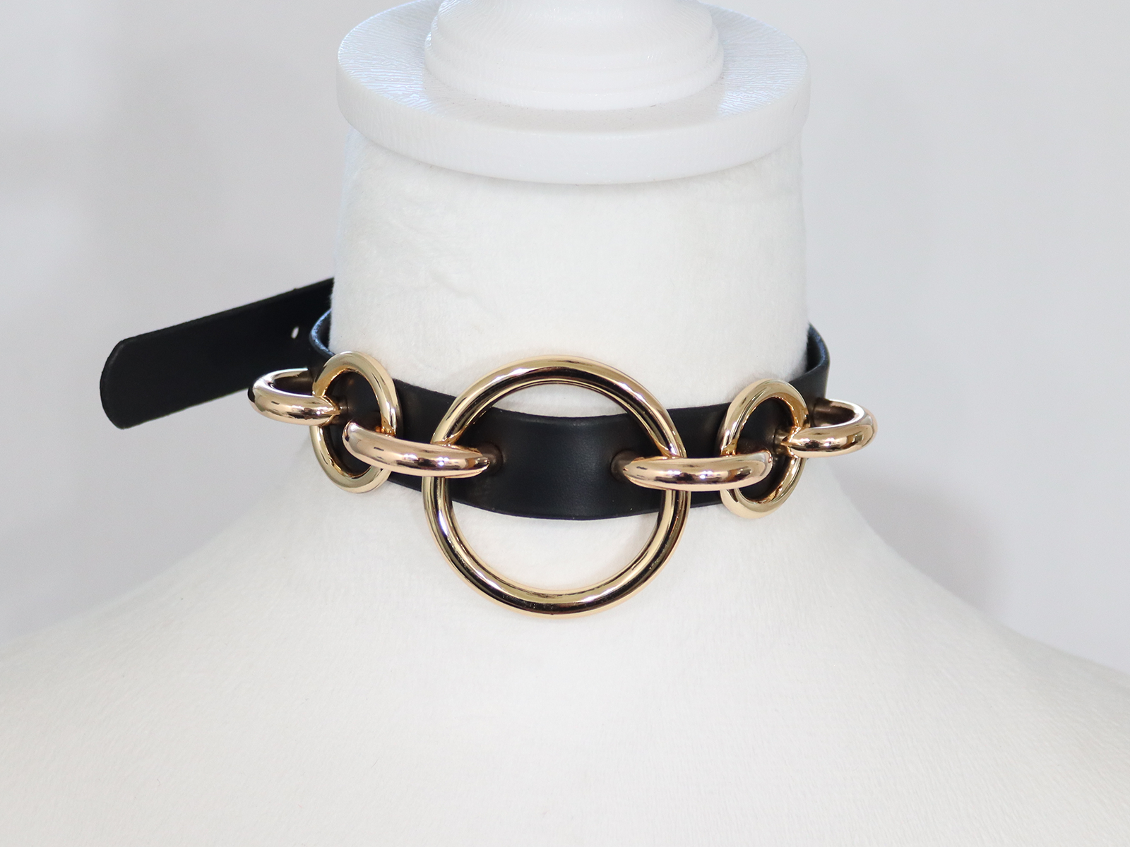This choker is adorned with four heavy duty arch buckles in two different sizes, two .75 inch O-rings, and one large central O-ring.