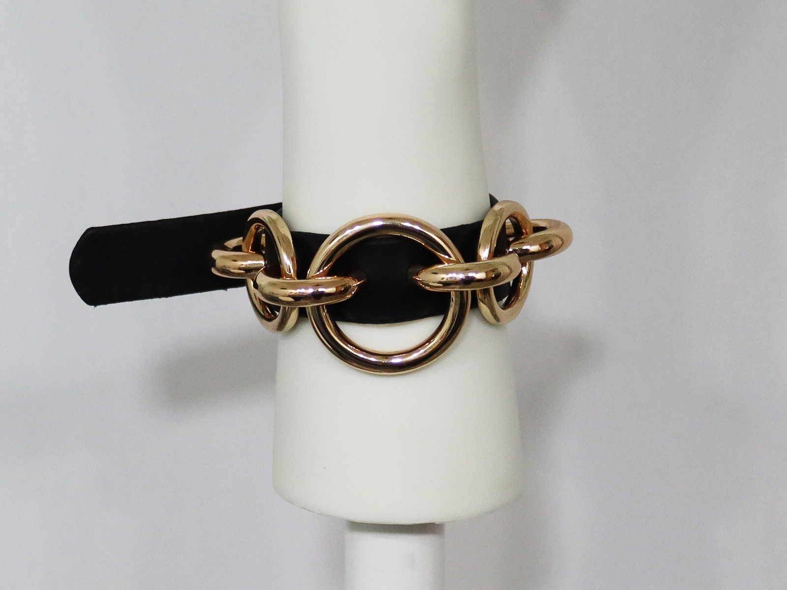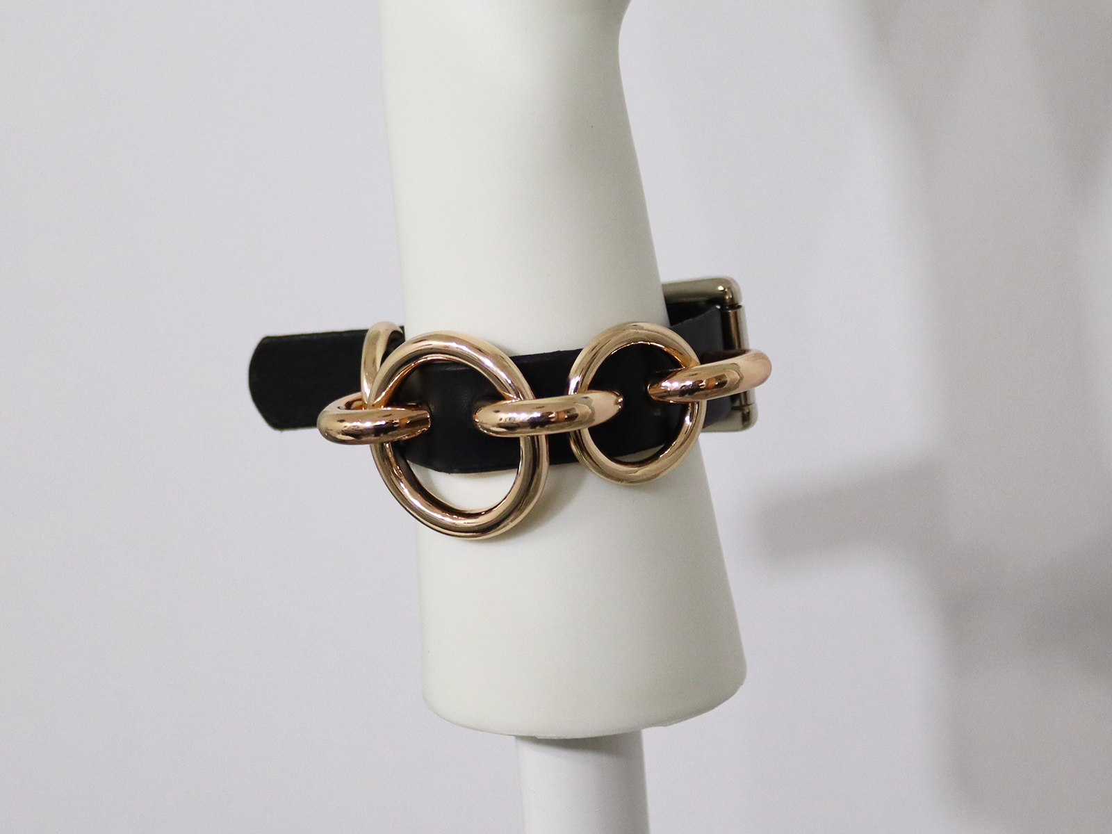 This cuff is adorned with four arch buckles holding two 0.75 inch O-rings and a central 1 inch O-ring.