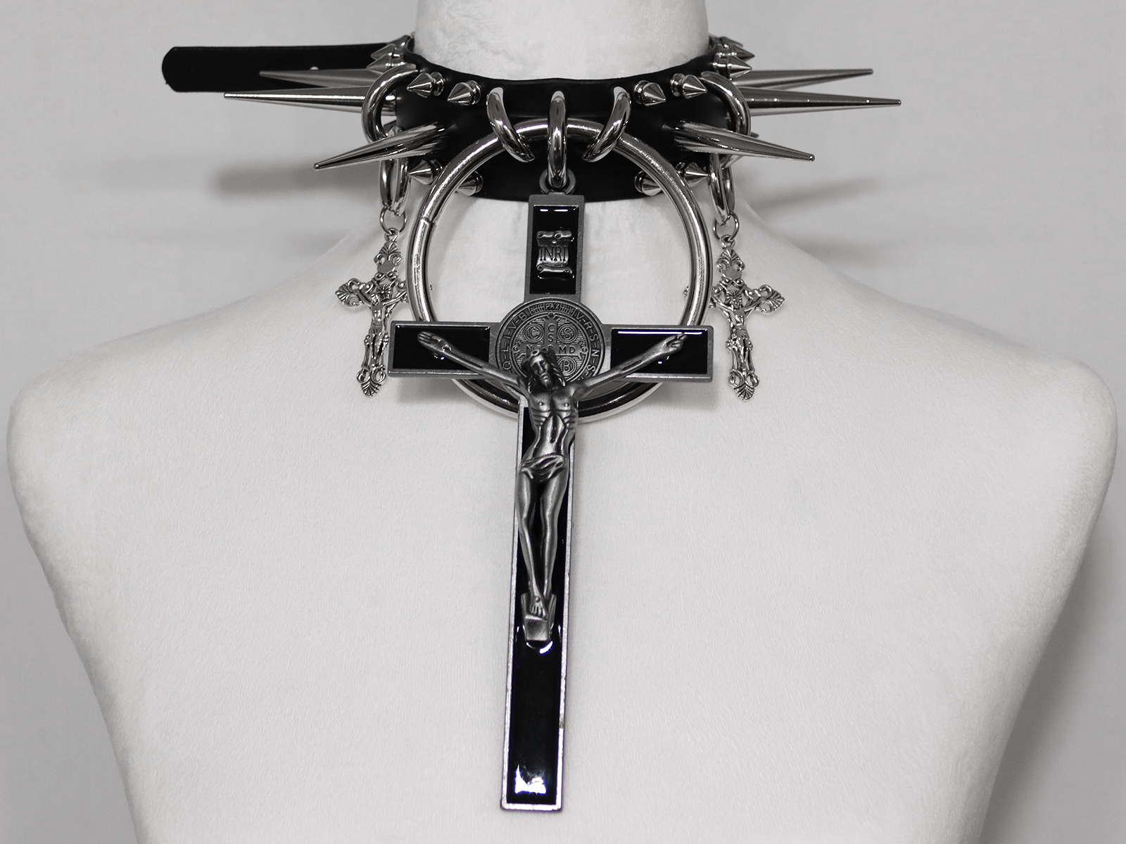 This huge choker weighs approximately one pound and is adorned with two inch long spikes, short tree spikes, .75 inch O-rings, various arch buckles, two small crucifixes, a 3 inch O-ring, and one large black crucifix measuring 7.5 inches long!