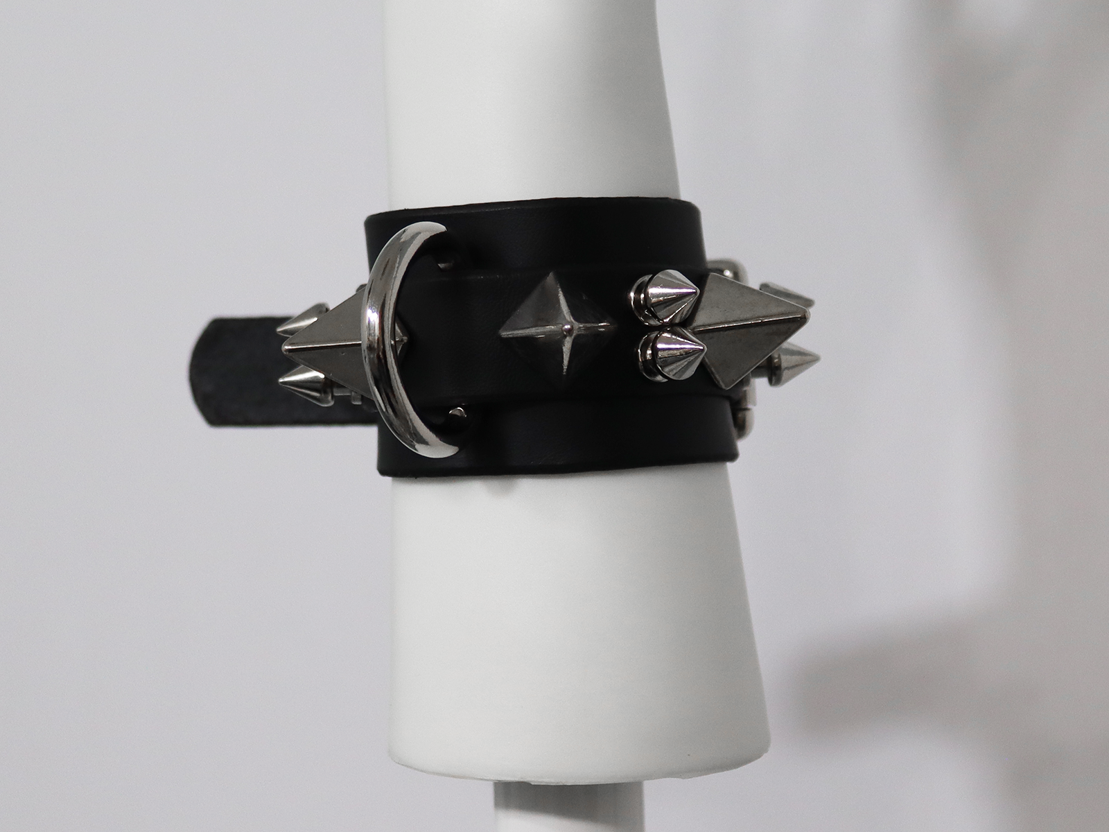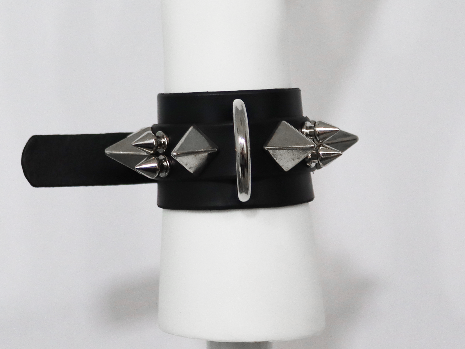 This cuff is adorned with a heavy duty .75 inch D-ring, 4 large pyramid shaped spikes, and 8 small tree spikes.